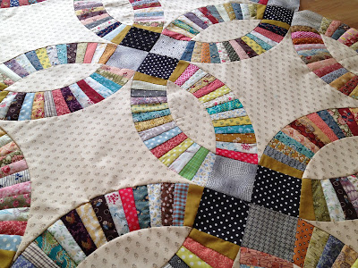 In the meantime, I've been quietly collecting fabrics to make the Trick or Treat basket quilt, and searching for certain kinds of fabrics for future projects, and also have three baby quilts to make! So while I make lists, sketch drawings, and make calculations, mull things over while sipping tea, my fingers keep moving on this Double Wedding Ring.....